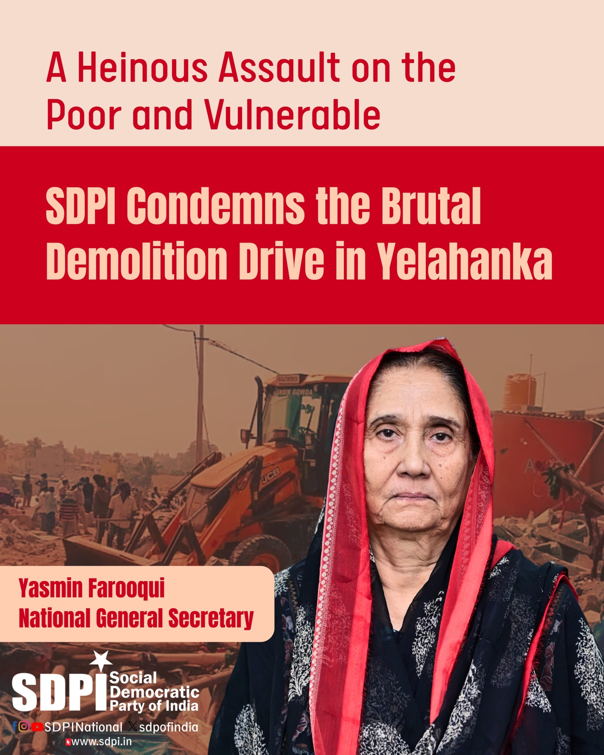The Social Democratic Party of India strongly condemns the heartless and inhumane demolition drive carried out by the Greater Bengaluru Authority and Bengaluru Solid Waste Management Limited on December 20, 2025, at Kogilu Layout in Yelahanka, Bengaluru. This operation conducted before dawn demolished more than 300 structures and rendered over 350 families homeless. The affected residents are largely Muslim Fakirs who have lived in this area for more than two decades. This action represents a grave betrayal of justice, humanity, and the constitutional rights of marginalized communities.