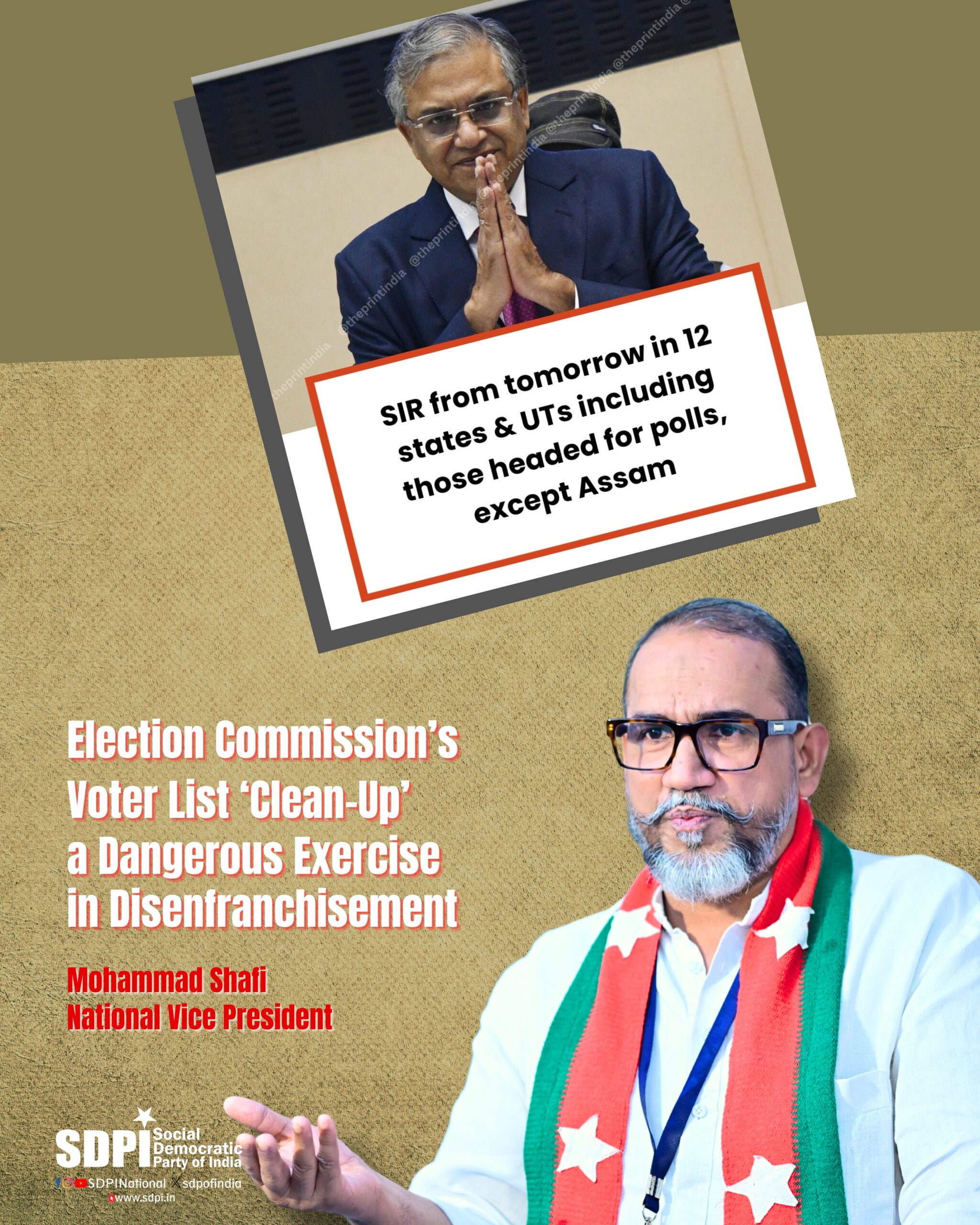 Mohammad Shafi, National Vice President, Social Democratic Party of India expresses its deep concern and strong opposition to the Election Commission of India’s recently announced Special Intensive Revision (SIR) of electoral rolls, set to begin on November 4 across twelve states and Union Territories. While the Election Commission claims that the exercise aims to remove duplicate and deceased entries to make the rolls “error-free,” in reality, it represents a politically motivated attempt to manipulate the electorate and disenfranchise millions of marginalized citizens.
