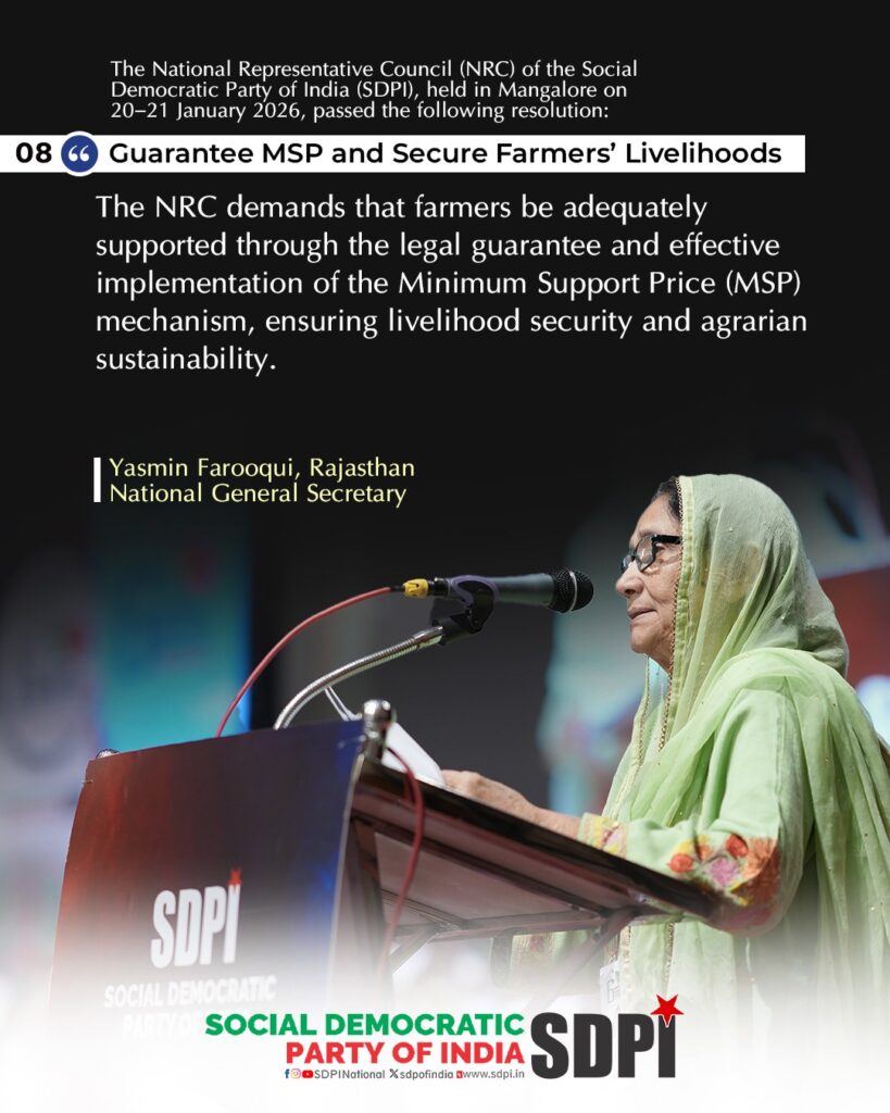The NRC demands that farmers be adequately supported through the legal guarantee and effective implementation of the Minimum Support Price (MSP) mechanism, ensuring livelihood security and agrarian sustainability.