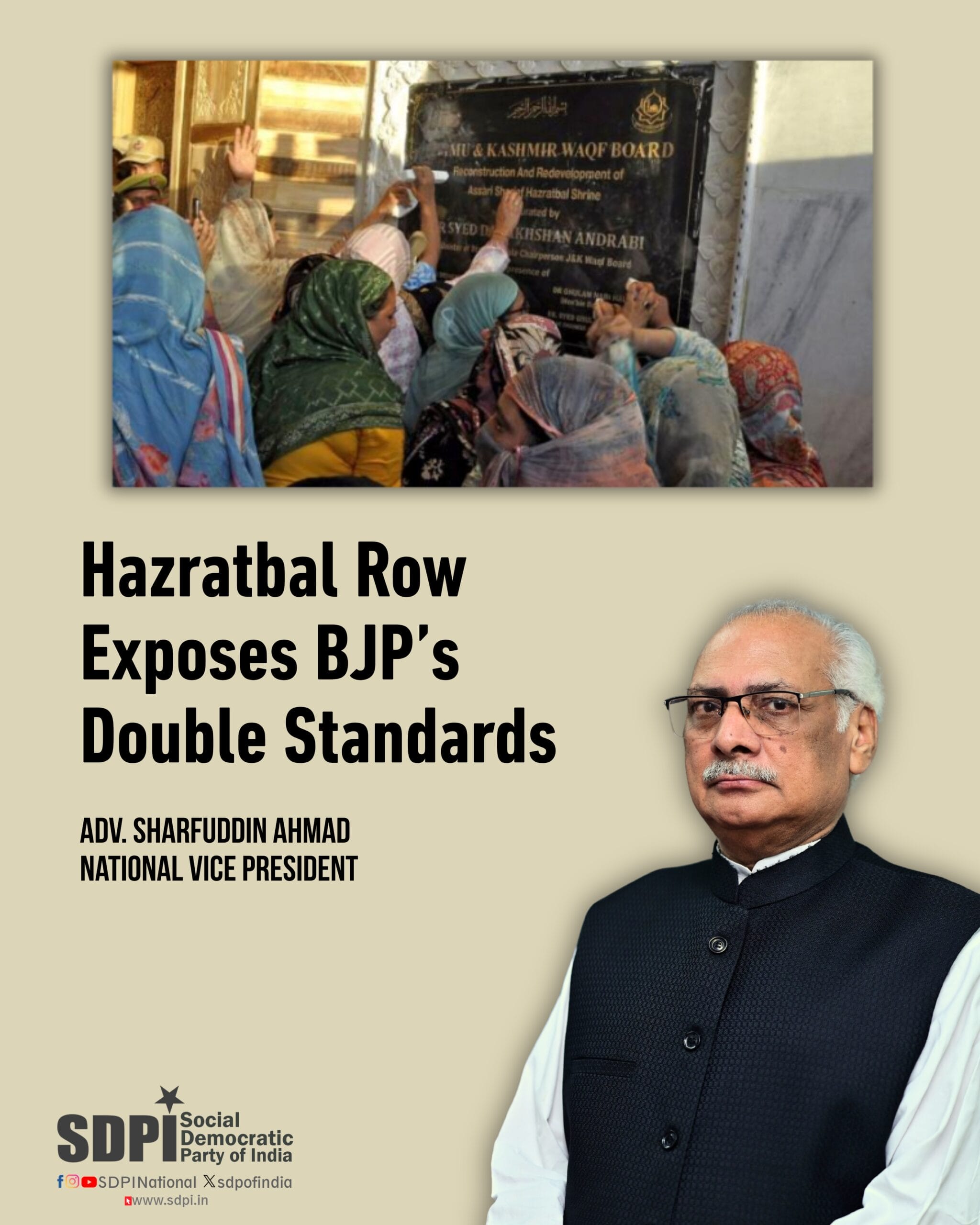Adv. Sharfuddin Ahmad, National Vice President of the Social Democratic Party of India, strongly condemns the recent actions of the Lieutenant Governor’s administration in Jammu and Kashmir, operating under the direct control of the Modi government. The a action apparantly appears not from a administratively balanced mind but from the Agent provocateur to calculatedly provoke unrest, polarize communities, and undermine the fragile peace of the Valley.Hazratbal is has always been respected as one of the highest seats of religious authority having full guarantee for the fundamental rights of minorities in the Constitution.This act is blatant and unnecessary interference to widen the communal cleavage distracting not only from the actual issues but also providing fuel to nasty elements into the valley as well as to pamper the indoctrinated anti-Kashmir groups with a view to yield political and electoral benefits in other parts of the country