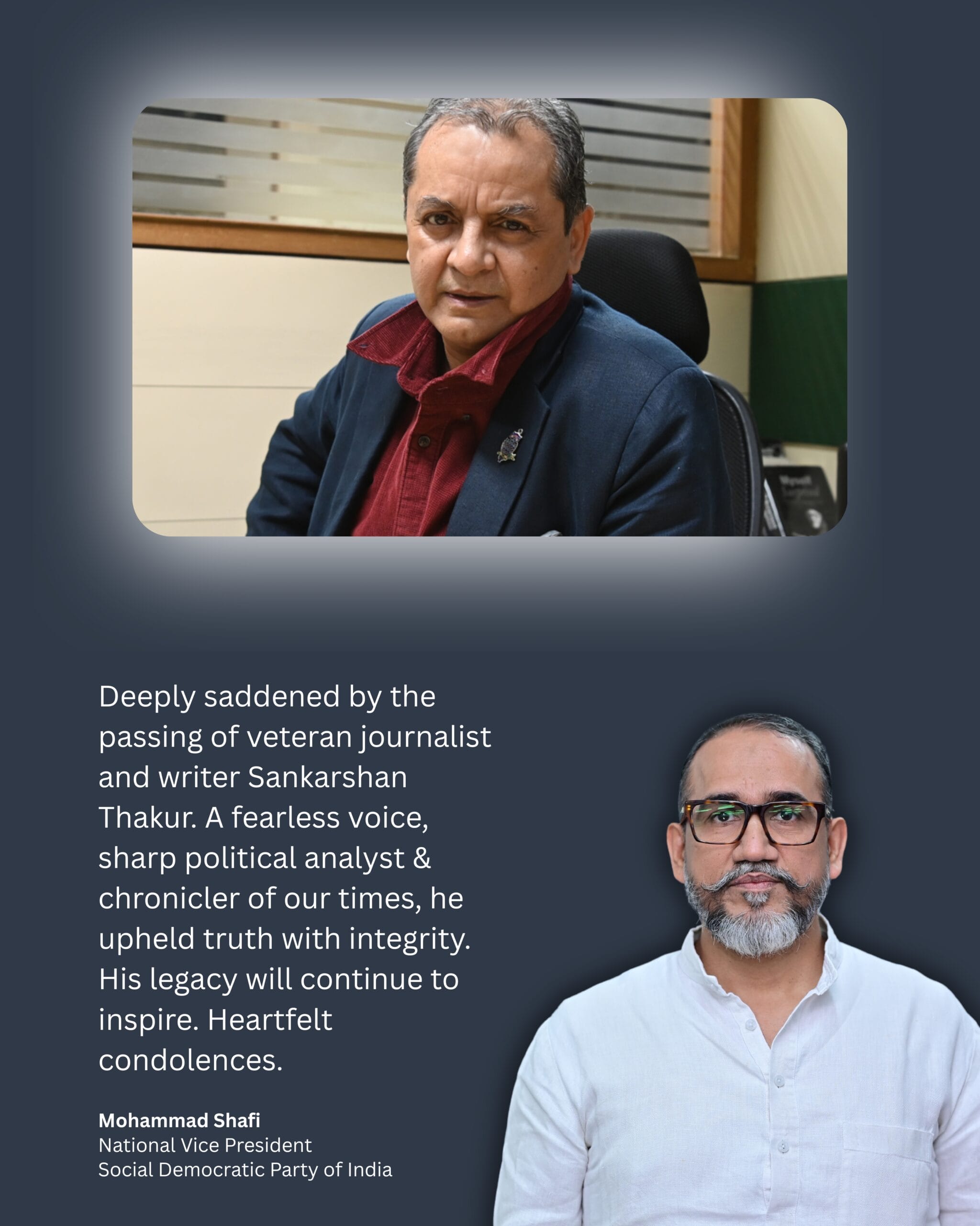 Deeply saddened by the passing of veteran journalist & writer Sankarshan Thakur. A fearless voice, sharp political analyst & chronicler of our times, he upheld truth with integrity. His legacy will continue to inspire. Heartfelt condolences.