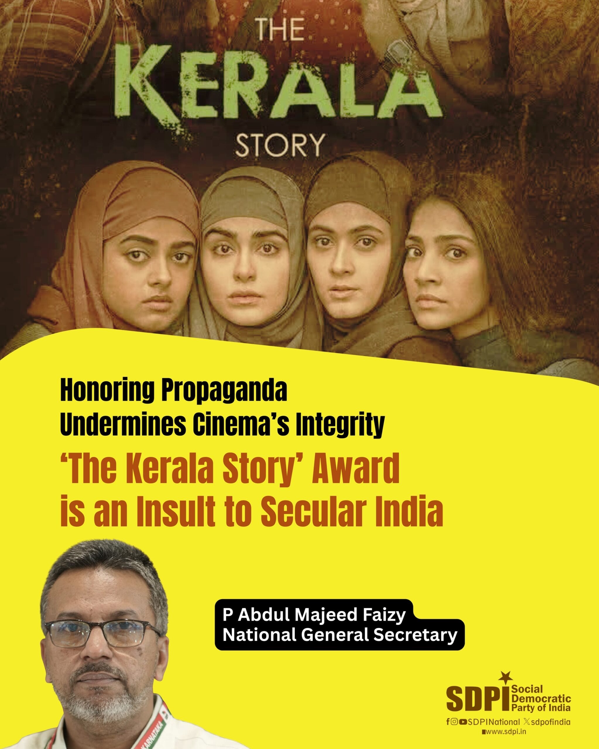 The Social Democratic Party of India strongly condemns the 71st National Film Awards’ decision to honor ‘The Kerala Story’ with Best Director and Best Cinematography awards, announced on August 1, 2025. This recognition of a film widely criticized for spreading divisive propaganda and misinformation undermines India’s secular values and the integrity of its cinematic heritage.