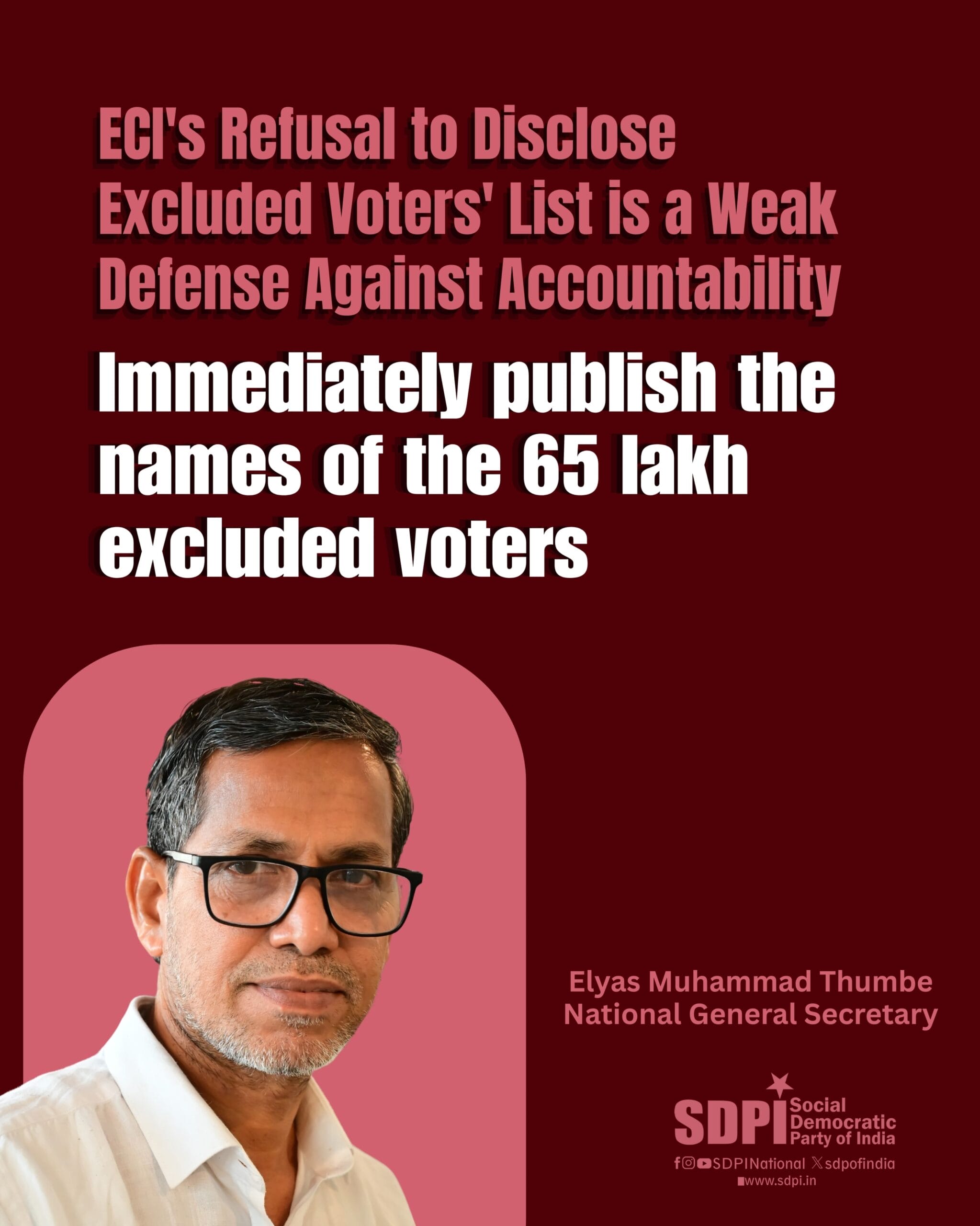 Elyas Muhammad Thumbe, National General Secretary of the Social Democratic Party of India unequivocally condemns the Election Commission of India’s refusal to disclose the list of 65 lakh voters excluded from Bihar’s draft electoral rolls following the first phase of the Special Intensive Revision (SIR), as revealed in their Supreme Court affidavit on August 9, 2025. This brazen opacity is a direct assault on democratic principles and the fundamental right to vote enshrined under Article 326 of the Constitution. The ECI’s claim that it is not statutorily required to publish names or reasons for exclusions is a flimsy excuse to evade accountability, raising serious suspicions of deliberate voter suppression targeting marginalized communities.