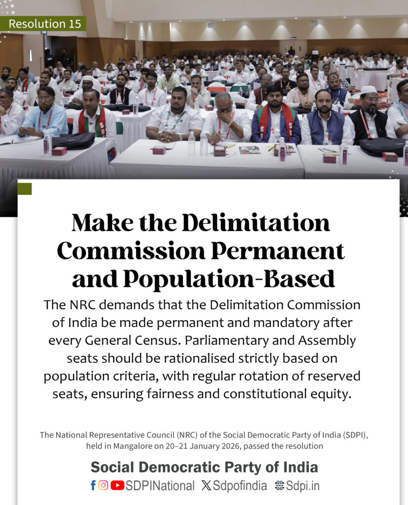 The NRC demands that the Delimitation Commission of India be made permanent and mandatory after every General Census. Parliamentary and Assembly seats should be rationalised strictly based on population criteria, with regular rotation of reserved seats, ensuring fairness and constitutional equity.