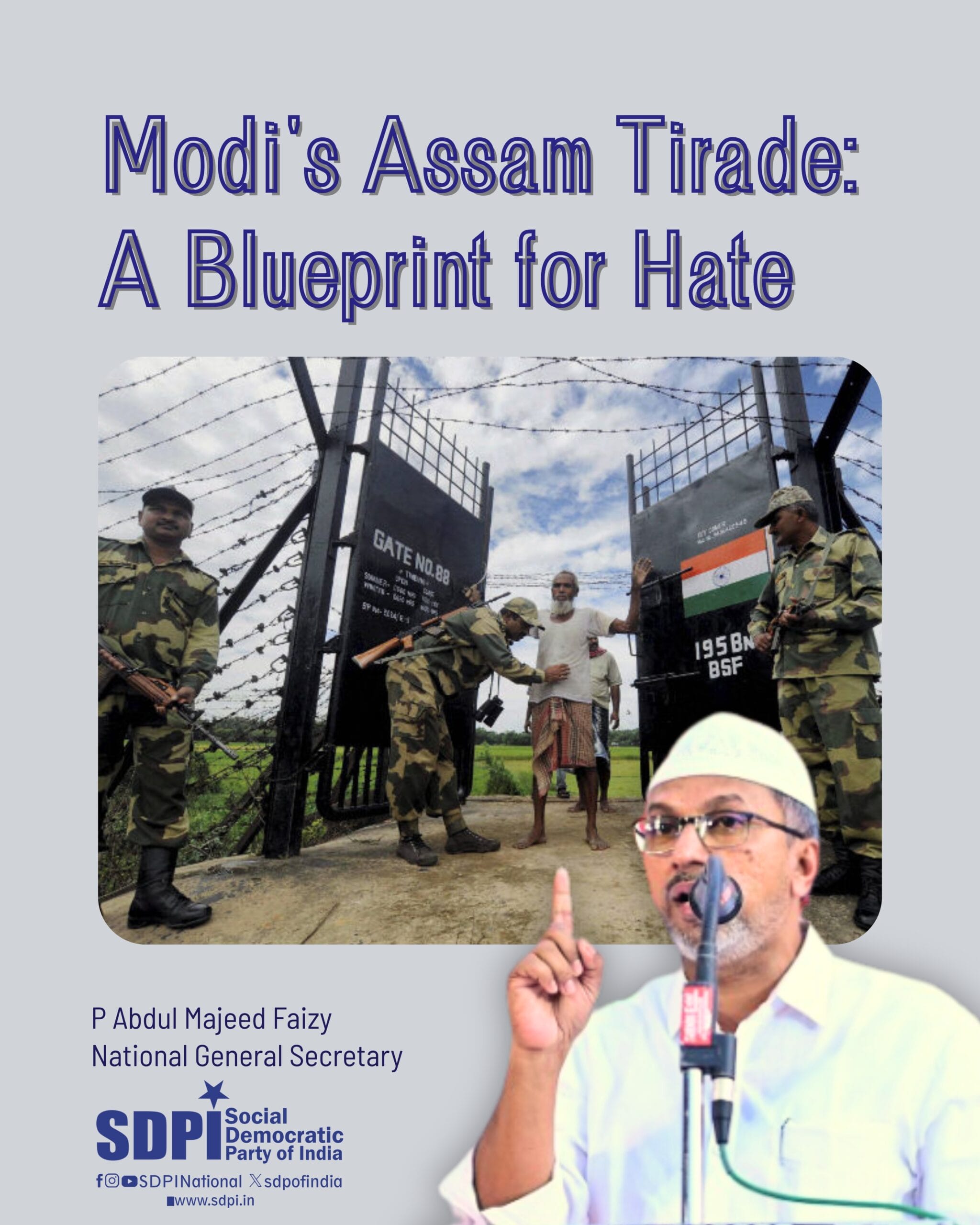 P Abdul Majeed Faizy, National General Secretary of the Social Democratic Party of India vehemently condemns Prime Minister Narendra Modi’s inflammatory speech in Darrang district, Assam, today, where he brazenly claimed the reclamation of “lakhs of acres” from so-called “infiltrators.” This rhetoric is not just a distortion of facts but a deliberate assault on the dignity and rights of millions of Indian citizens, masquerading as national security. Modi’s words echo the BJP’s toxic playbook of communal polarization, designed to vilify an entire community for electoral dividends while ignoring the ground realities of injustice and suffering.