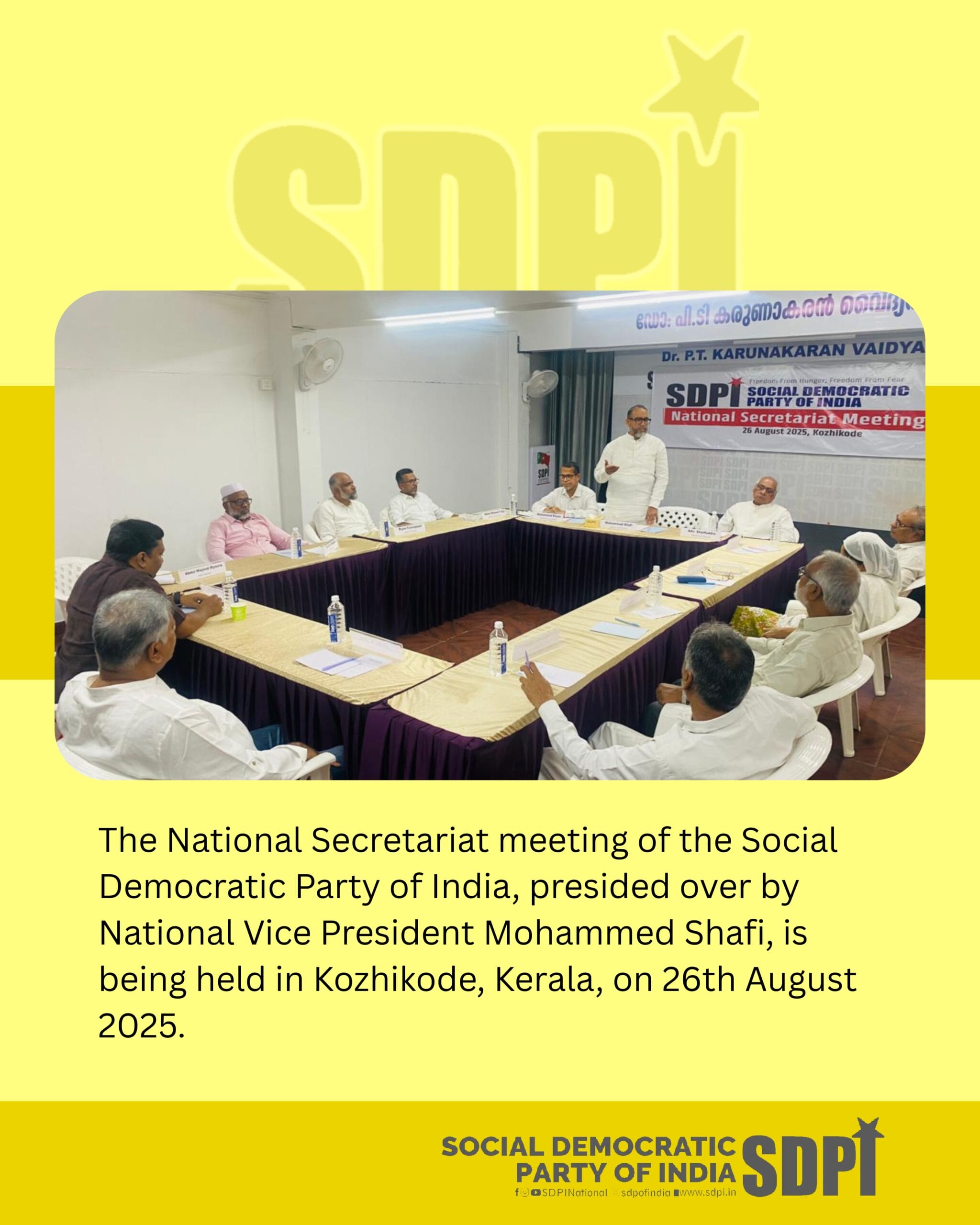 The National Secretariat meeting of the Social Democratic Party of India, presided over by National Vice President Mohammed Shafi, is being held in Kozhikode, Kerala, on 26 August 2025.