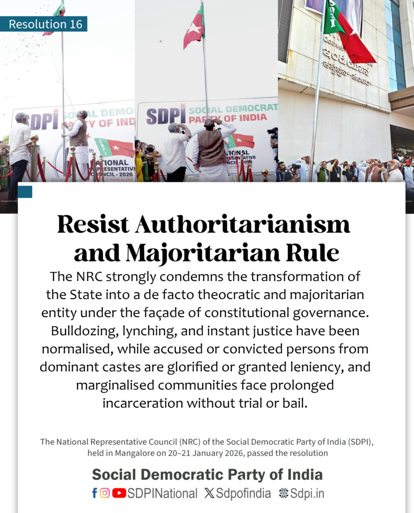 The NRC strongly condemns the transformation of the State into a de facto theocratic and majoritarian entity under the façade of constitutional governance. Bulldozing, lynching, and instant justice have been normalised, while accused or convicted persons from dominant castes are glorified or granted leniency, and marginalised communities face prolonged incarceration without trial or bail.