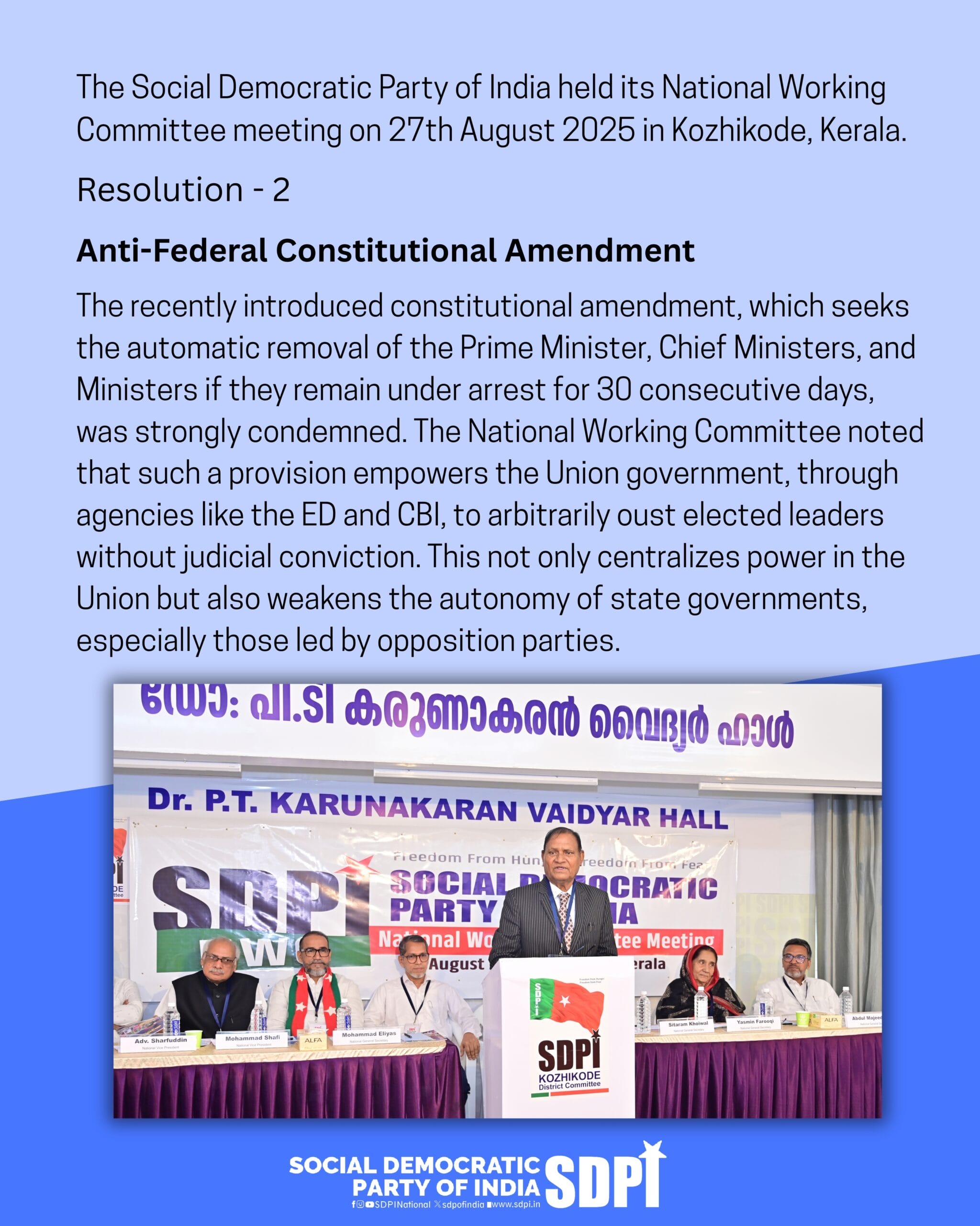 The National Working Committee (NWC) of the Social Democratic Party of India (SDPI) convened its meeting on 27th August 2025 in Kozhikode, under the chairmanship of National Vice President Mohammad Shafi. The committee deliberated on the prevailing political scenario in the country and the forthcoming Bihar Assembly election.
