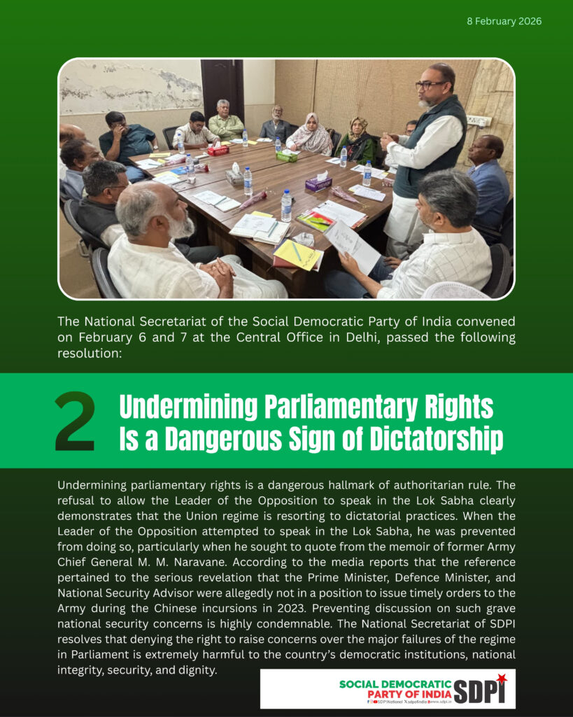The National Secretariat of the Social Democratic Party of India convened on February 6 and 7 at the Central Office in Delhi and passed the following resolution: