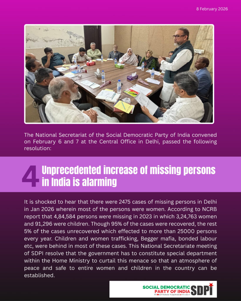 The National Secretariat of the Social Democratic Party of India convened on February 6 and 7 at the Central Office in Delhi and passed the following resolution: