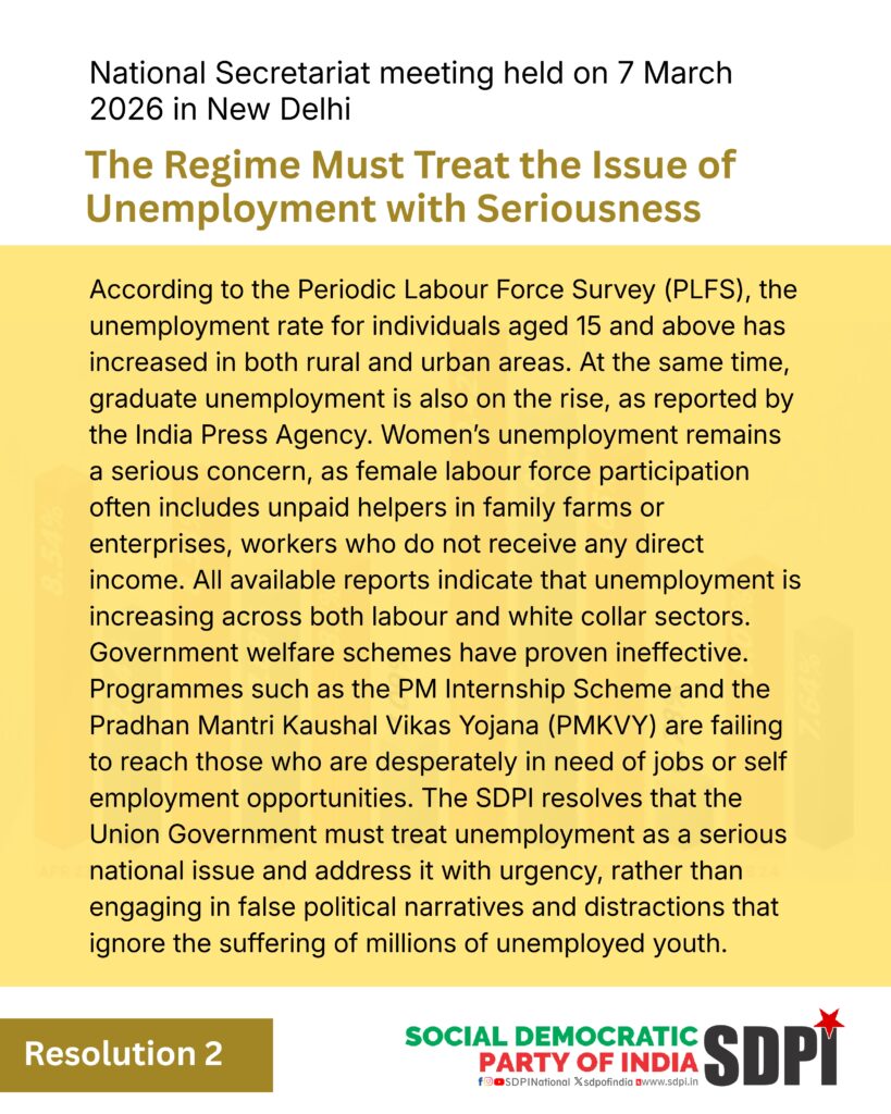 The SDPI resolves that the Union Government must treat unemployment as a serious national issue and address it with urgency, rather than engaging in false political narratives and distractions that ignore the suffering of millions of unemployed youth.