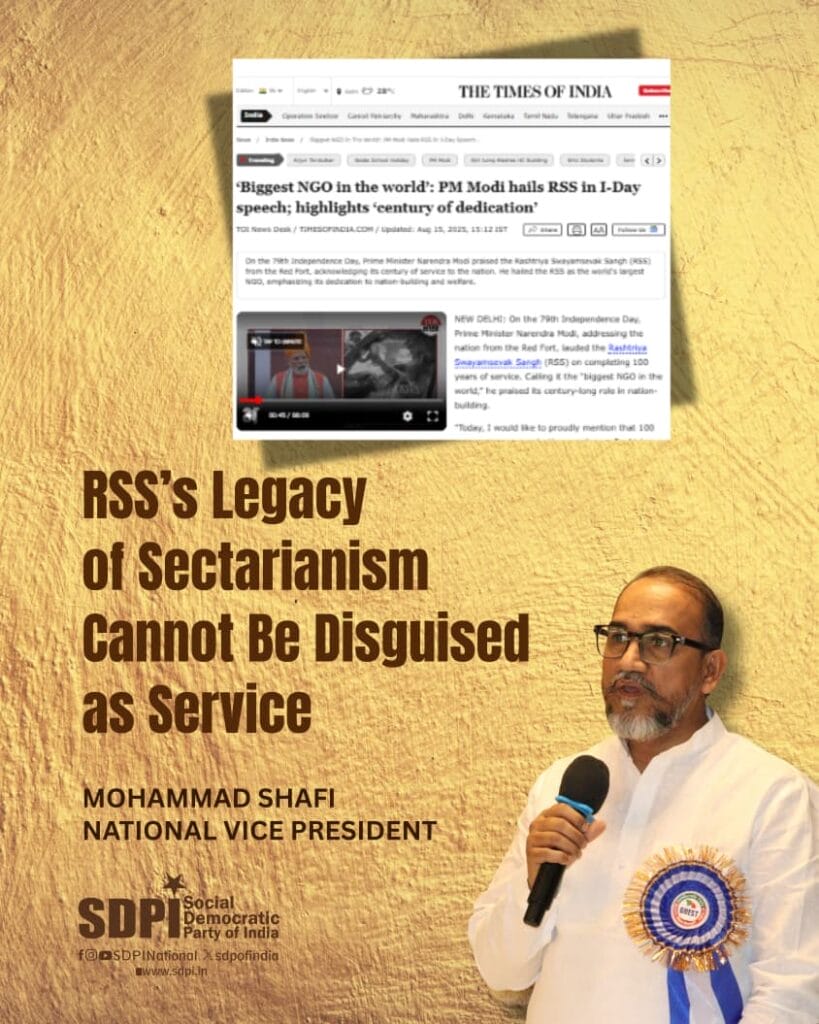 Mohammad Shafi, National Vice President of the Social Democratic Party of India, strongly condemns the misleading claims made by Prime Minister Narendra Modi in his Independence Day address. In his speech, Modi described the RSS as the “biggest NGO in the world” and praised its “century of dedication.” These assertions, politically expedient for the BJP and its ideological parent, are factually baseless and stand in direct contradiction to historical evidence and multiple judicial inquiries.