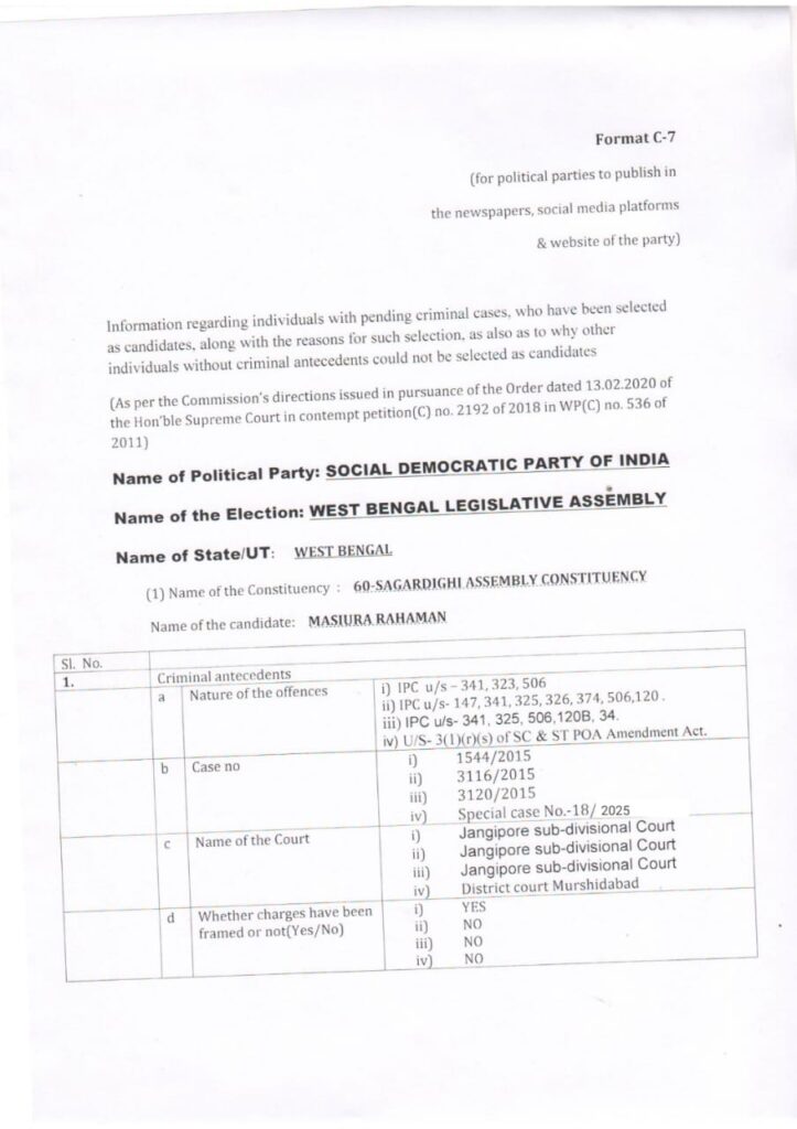 In the upcoming West Bengal Legislative Assembly elections, Masiur Rahman is contesting as the alliance candidate from the 60 No. Sagardighi Assembly constituency and following are the details of Criminal antecedents of candidate.