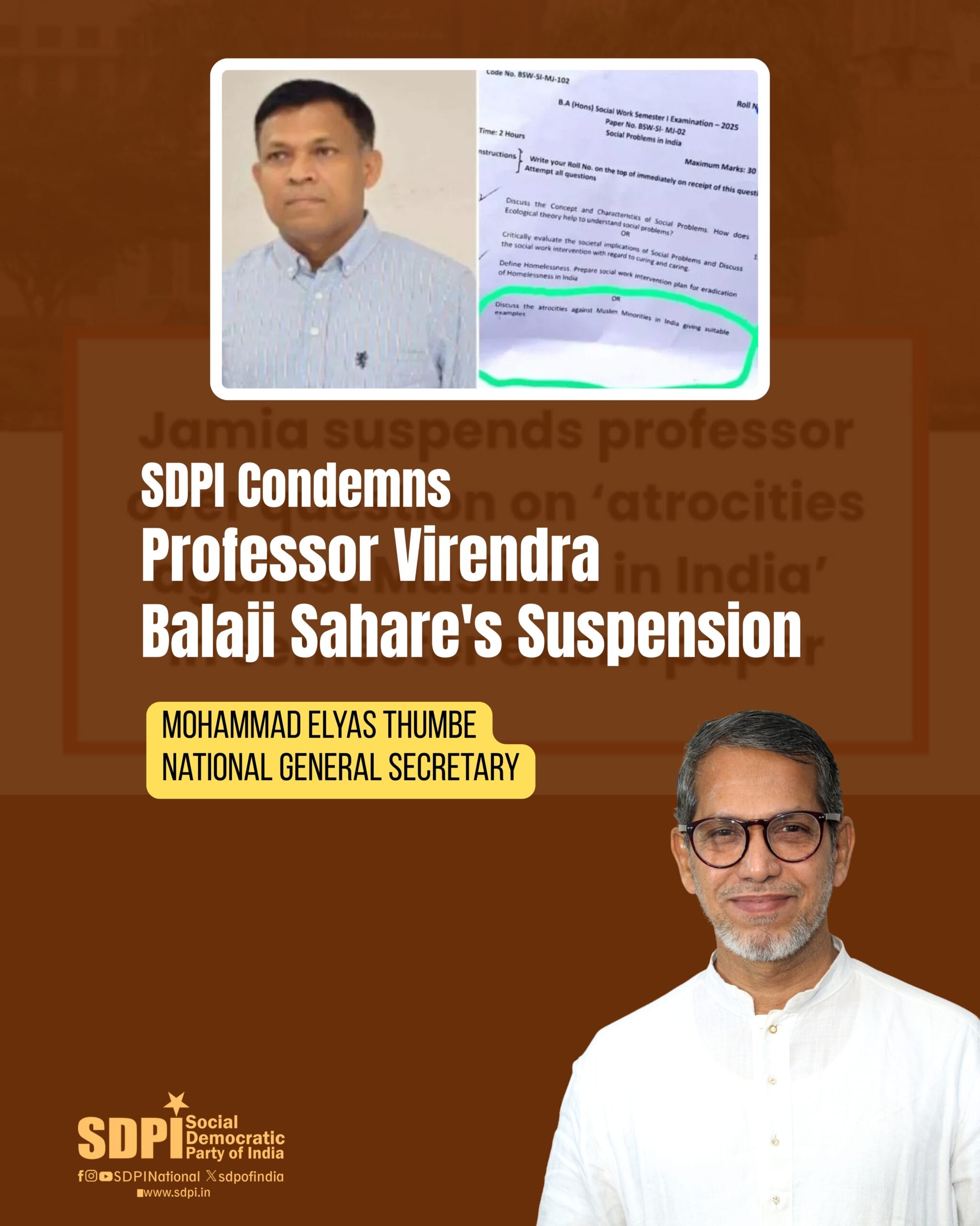 Mohammad Elyas thumbe, National General Secretary of the Social Democratic Party of India strongly condemns the arbitrary suspension of Professor Virendra Balaji Sahare, a senior Dalit faculty member in the Department of Social Work at Jamia Millia Islamia, over a legitimate academic question in an examination paper. We deeply disturbed by this blatant assault on academic freedom and intellectual inquiry. The question, which asked students to discuss atrocities against Muslim minorities in India with suitable examples, addresses well documented social realities such as communal violence, lynchings, and discriminatory policies that have plagued our nation. Instead of fostering critical thinking, the university’s hasty decision to suspend the professor and threaten an FIR reflects a cowardly capitulation to external pressures from right wing elements, undermining the very essence of higher education in a democratic society.