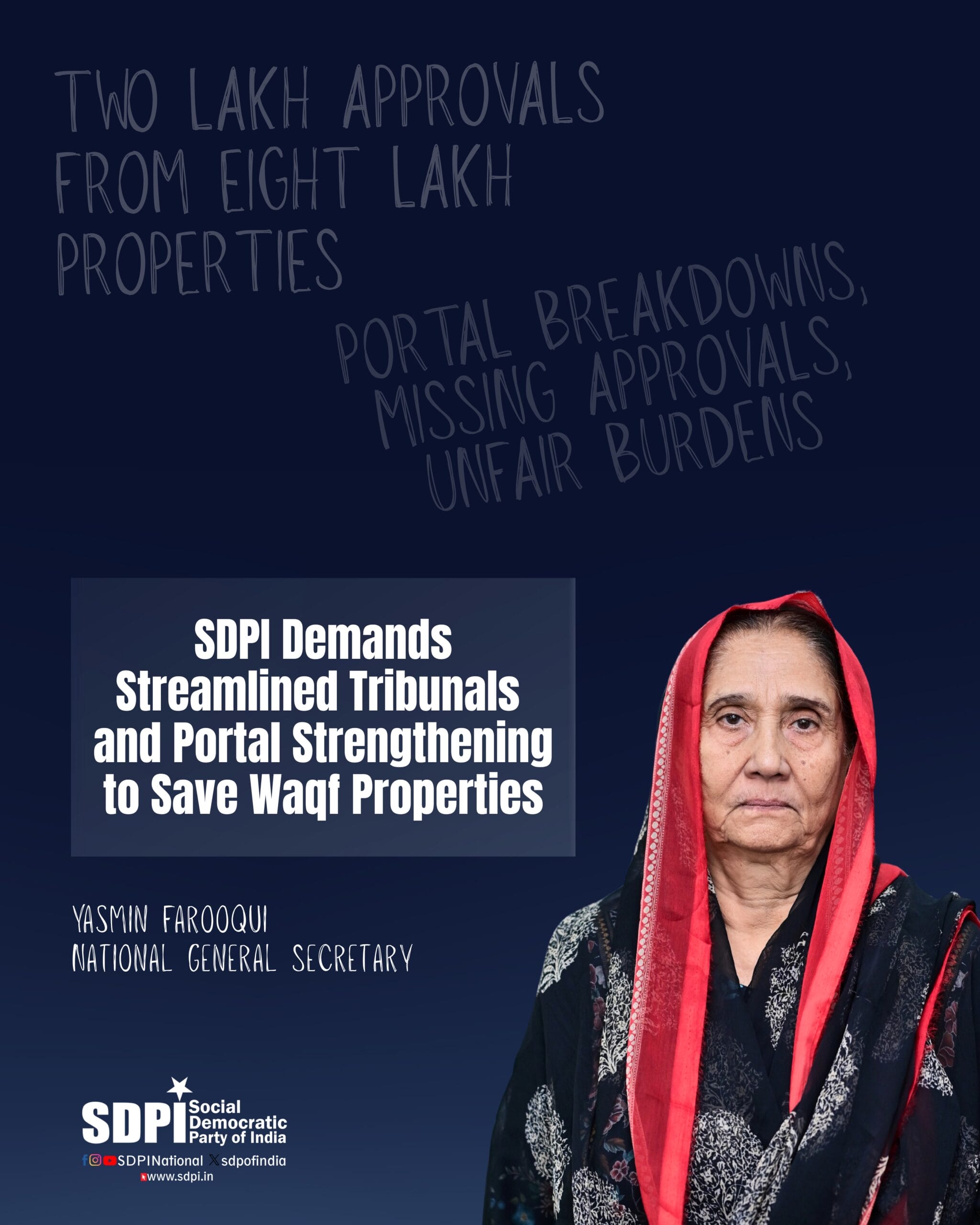 As the six month deadline for uploading Waqf property details to the Unified Waqf Management, Empowerment, Efficiency and Development portal ended on December 6, the Social Democratic Party of India expresses strong concern over the unprecedented difficulties faced by the Muslim community in meeting the requirements of the Waqf Amendment Act, 2025. I, Yasmin Farooqui, National General Secretary of SDPI, urge the Central Government and state Waqf Tribunals to show maximum leniency so that no Waqf asset is excluded because of technical or administrative failures.