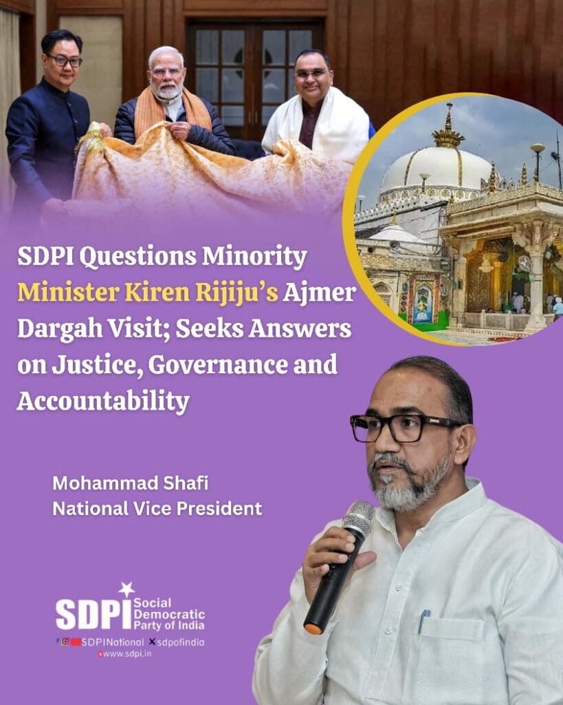 Union Minority Affairs Minister Kiren Rijiju on Monday offered a chadar at the Dargah of Khwaja Saheb in Ajmer, marking the first day of the six-day annual Urs. Responding to the visit, the Social Democratic Party of India (SDPI) has described the gesture as symbolic and evasive, and has demanded clear, public answers on long-pending issues related to justice, statutory governance, financial propriety, and the safety and dignity of one of India’s most revered Sufi shrines.