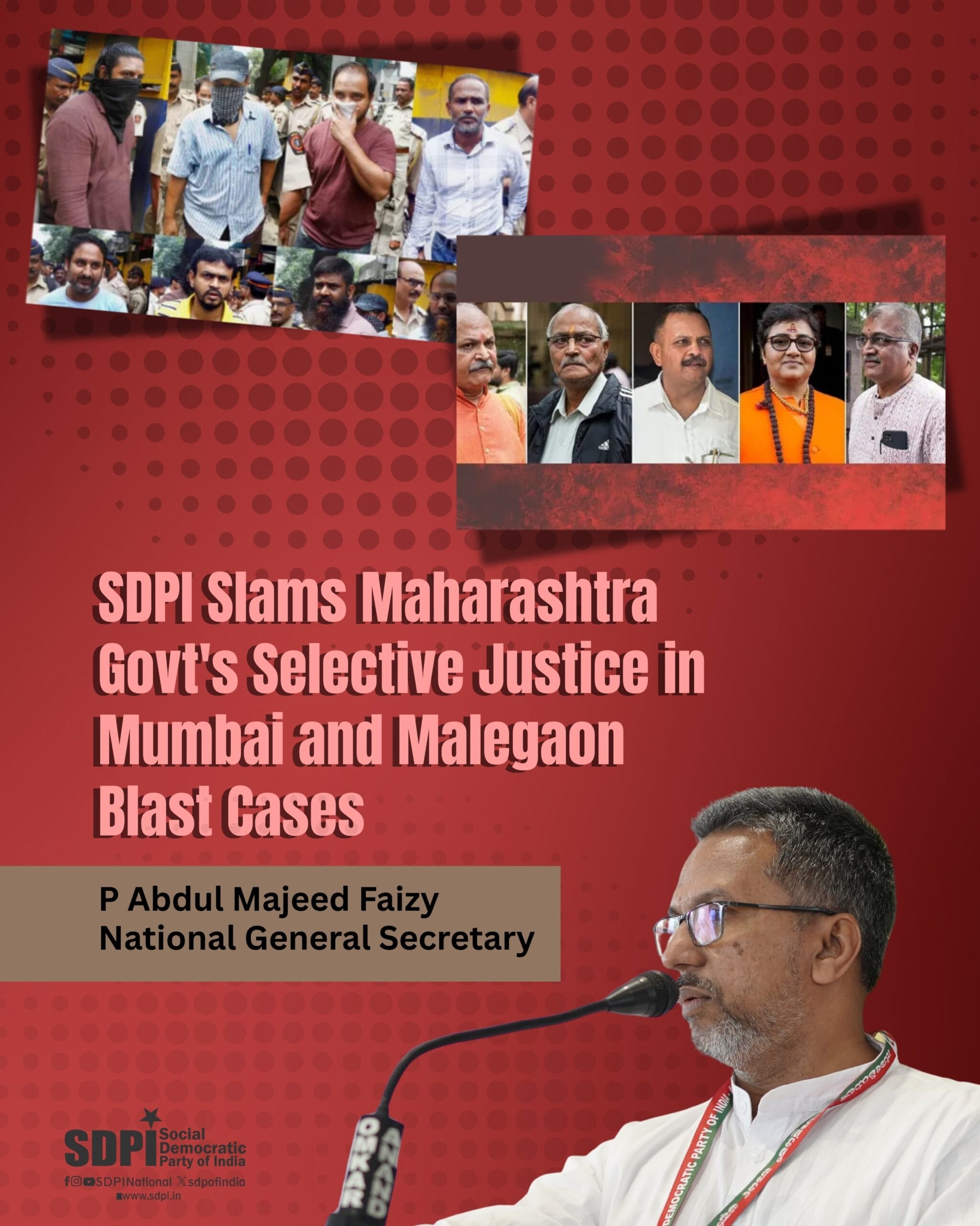 P Abdul Majeed Faizy, National General Secretary of the Social Democratic Party of India strongly condemns the maharashtra government’s discriminatory approach in addressing the acquittals in the 2006 mumbai train blasts and 2008 malegaon bomb blast cases. The stark contrast in the state’s response to these verdicts raises serious questions about its commitment to impartial justice and exposes a troubling bias that undermines the rule of law.
