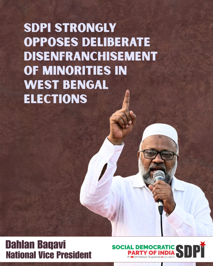 Dahlan Baqavi, National Vice President of the Social Democratic Party of India, today strongly opposed the deliberate disenfranchisement of minorities in West Bengal ahead of the 2026 Assembly elections through the Election Commission of India’s Special Intensive Revision of electoral rolls. In Nandigram constituency, where the community forms only 25 percent of the population, 95.5 percent of the deleted voters in the supplementary lists are Muslims according to the analysis of Election Commission data. This glaring disproportionality exposes a deeply biased and unfair process.