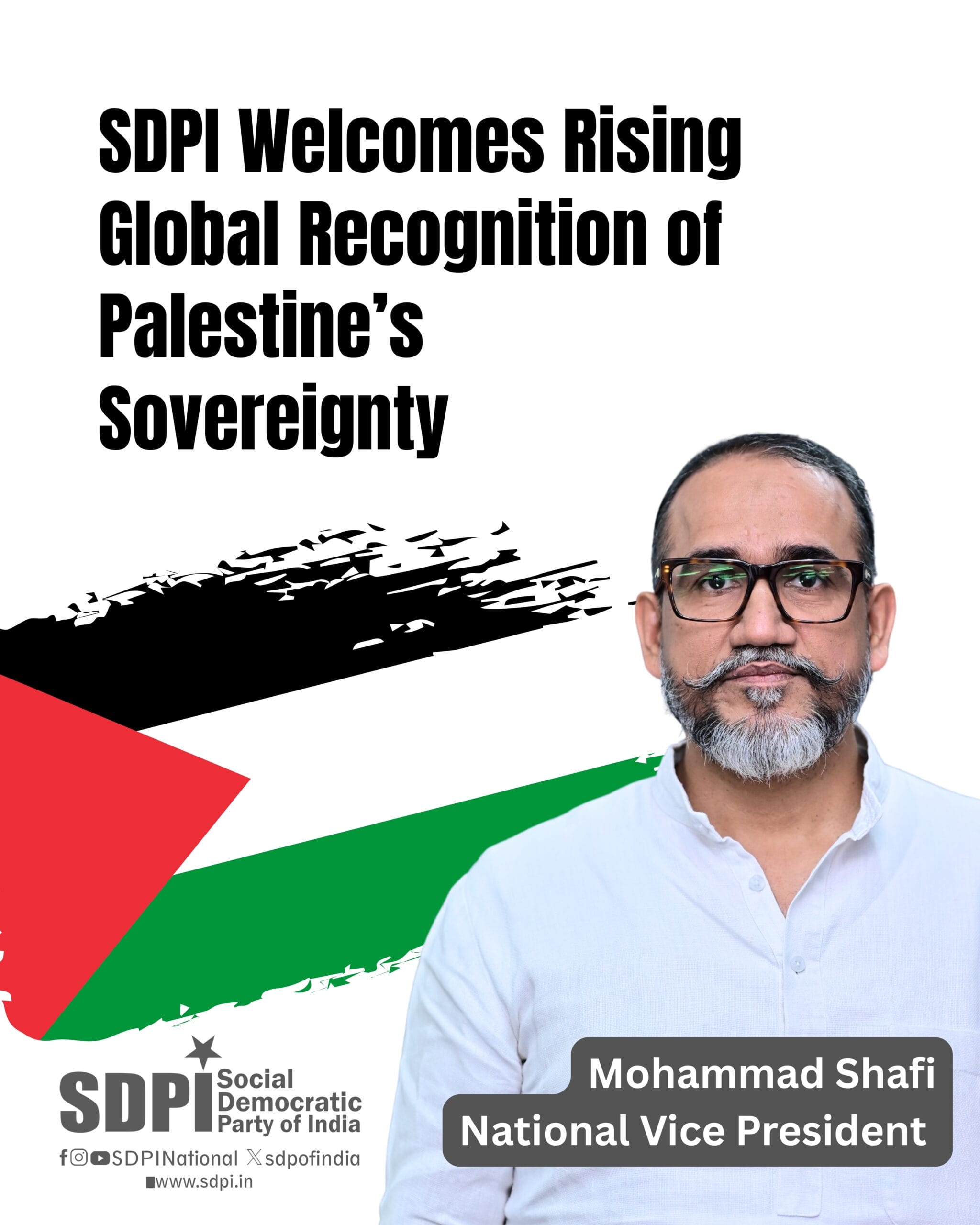 Mohammad Shafi, National Vice President of the Social Democratic Party of India, welcomes the growing international consensus in favor of recognizing the sovereign State of Palestine. It is encouraging that, as of September 2025, 151 United Nations member states—representing more than 78% of the global community—have formally recognized Palestine’s sovereignty. This surge in support, particularly since 2024 in the backdrop of the continuing humanitarian catastrophe in Gaza, reflects a decisive shift in global diplomacy towards justice, human rights, and the Palestinian people’s right to self-determination.