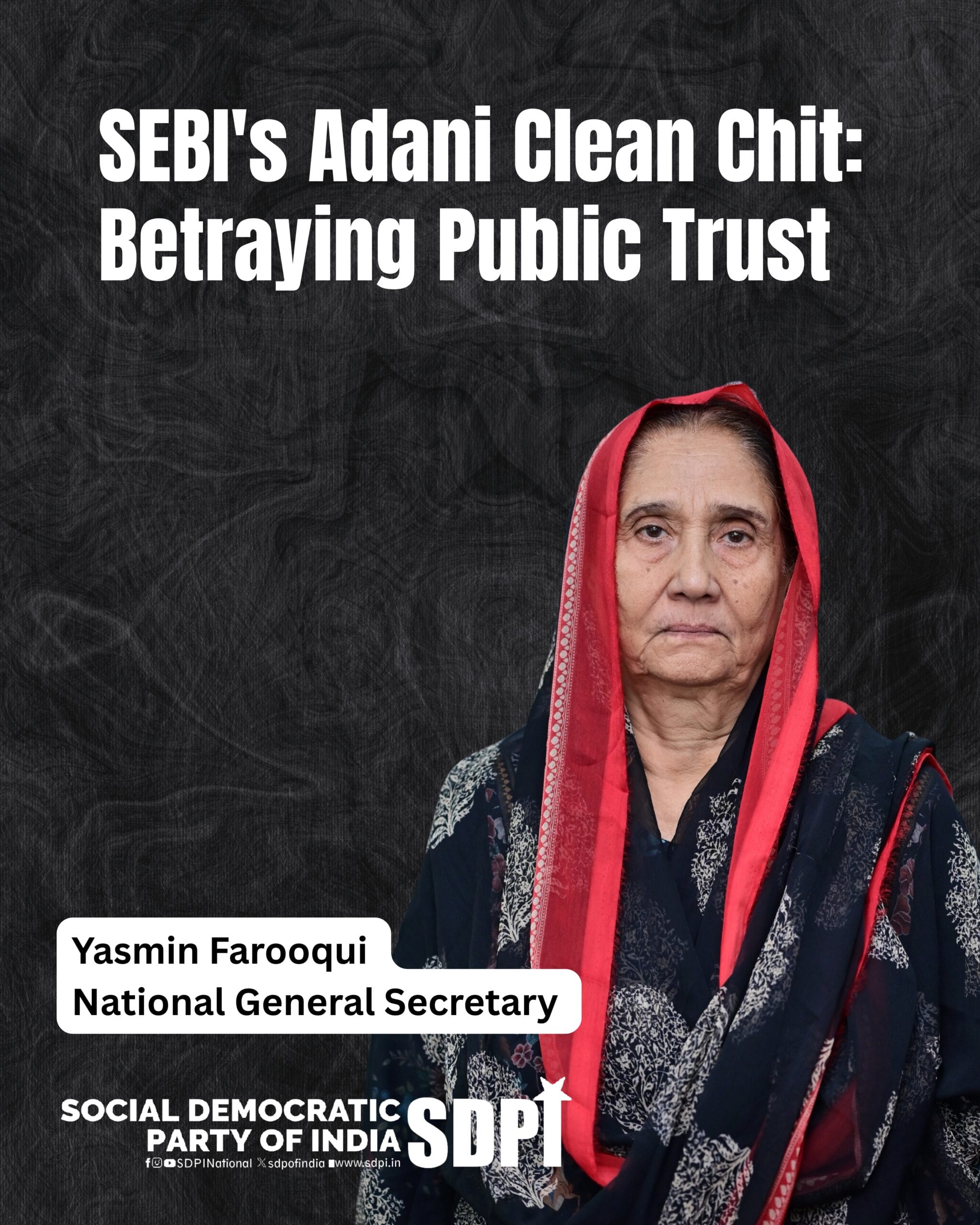 Yasmin Farooqui, National General Secretary of the Social Democratic Party of India (SDPI), strongly condemns the Securities and Exchange Board of India (SEBI) for granting a so-called “clean chit” to the Adani Group in the Hindenburg Research allegations. This decision reeks of institutional bias and a deliberate attempt to shield crony capitalists at the cost of ordinary Indians and the nation’s economy.