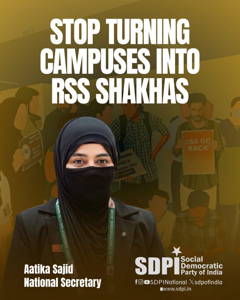 It is deeply alarming that university administrations impose restrictions on ordinary student activities while extending permission and protection to RSS-linked events with heavy police deployment. This selective approach exposes administrative bias and undermines trust in institutional neutrality. The SDPI stands firmly with students resisting this ideological aggression and demands that public campuses remain independent, inclusive, and free from all forms of communal and partisan domination.