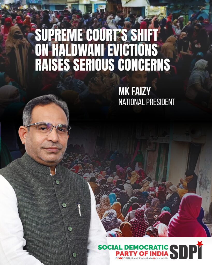 The Social Democratic Party of India expresses deep concern over the Supreme Court’s ruling of 24 February 2026 in the Haldwani railway land matter, which departs from the Court’s compassionate position adopted in 2024. This shift threatens nearly fifty thousand residents, largely poor and long settled families in Banbhoolpura, and sets a troubling precedent for the rights of marginalised communities across the country. In July and September 2024, the Court had clearly stated that rehabilitation must precede eviction and observed that the affected people “are also human beings.” It had directed the Uttarakhand government, the Union government and the Railways to prepare a comprehensive rehabilitation plan, acknowledging the grave human cost of displacing families who have lived on the land for decades with schools, places of worship and community institutions firmly rooted there.