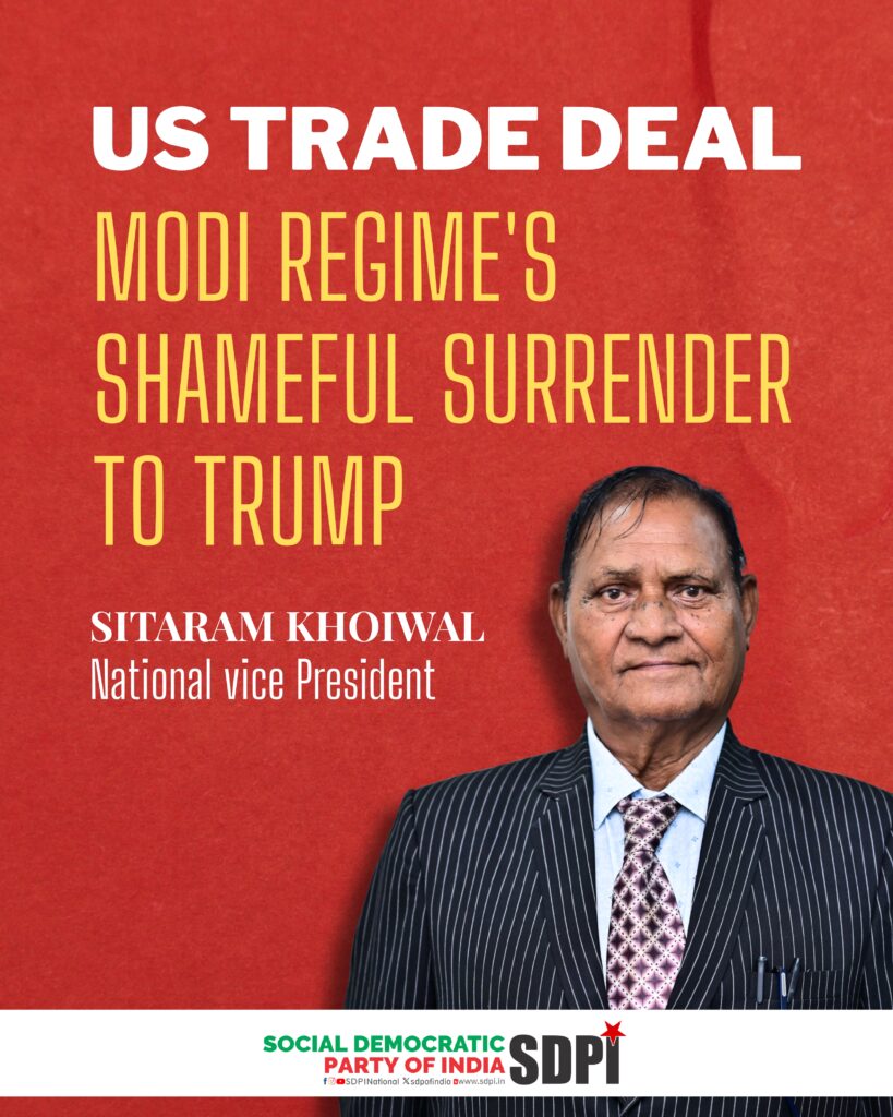 Sitaram Khoiwal, national vice president of the Social Democratic Party of India, strongly condemned Modi regime’s recent trade deal with the United States, describing it as a shameful capitulation that undermines India’s sovereignty and economic independence and demands a parliamentary debate on the proposed Indo-US trade deal affecting Indian farmers.