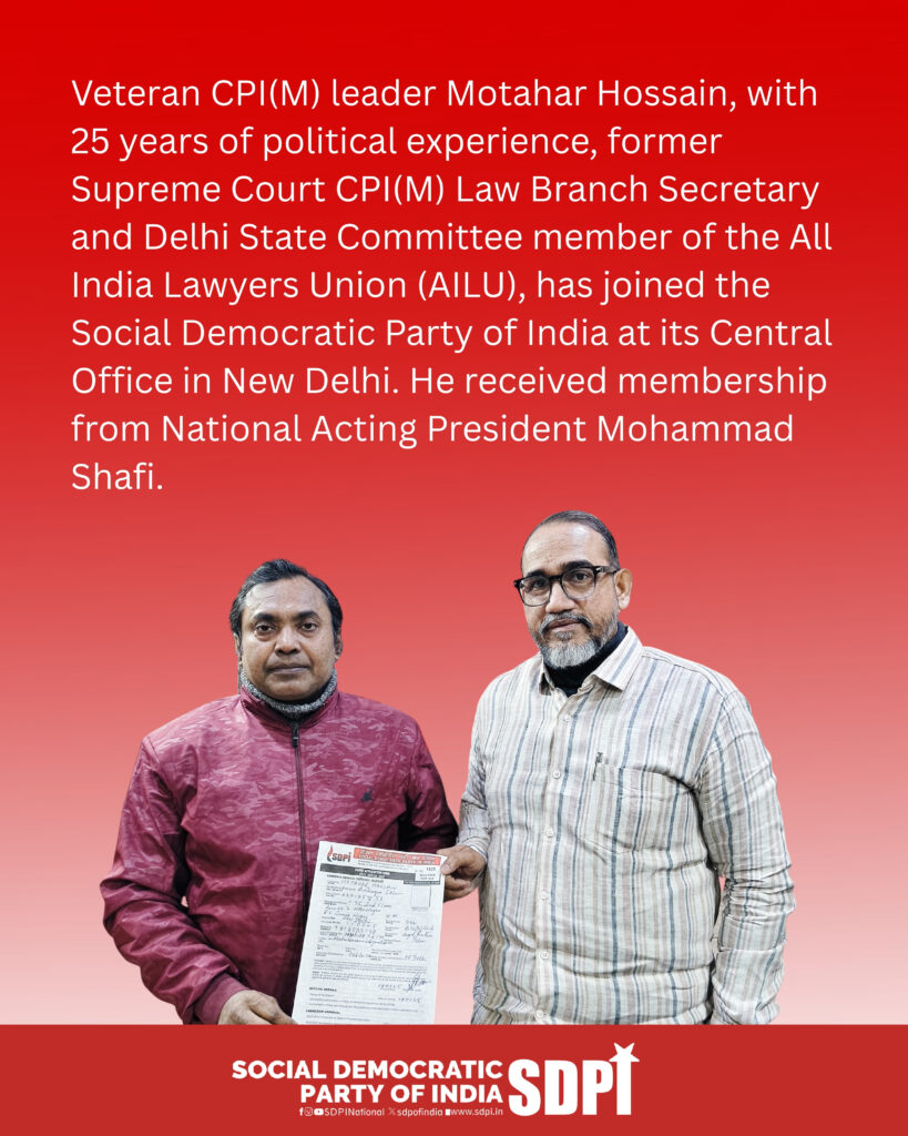 Veteran leader Motahar Hossain, with over 25 years of experience in the CPI(M), has joined the Social Democratic Party of India at the party’s Central Office in New Delhi. A prominent figure in the legal and political sphere, he has served as the Supreme Court CPI(M) Law Branch Secretary, a member of the Delhi State Committee, and as a leader of the All India Lawyers Union, a frontal organisation of the CPI(M).